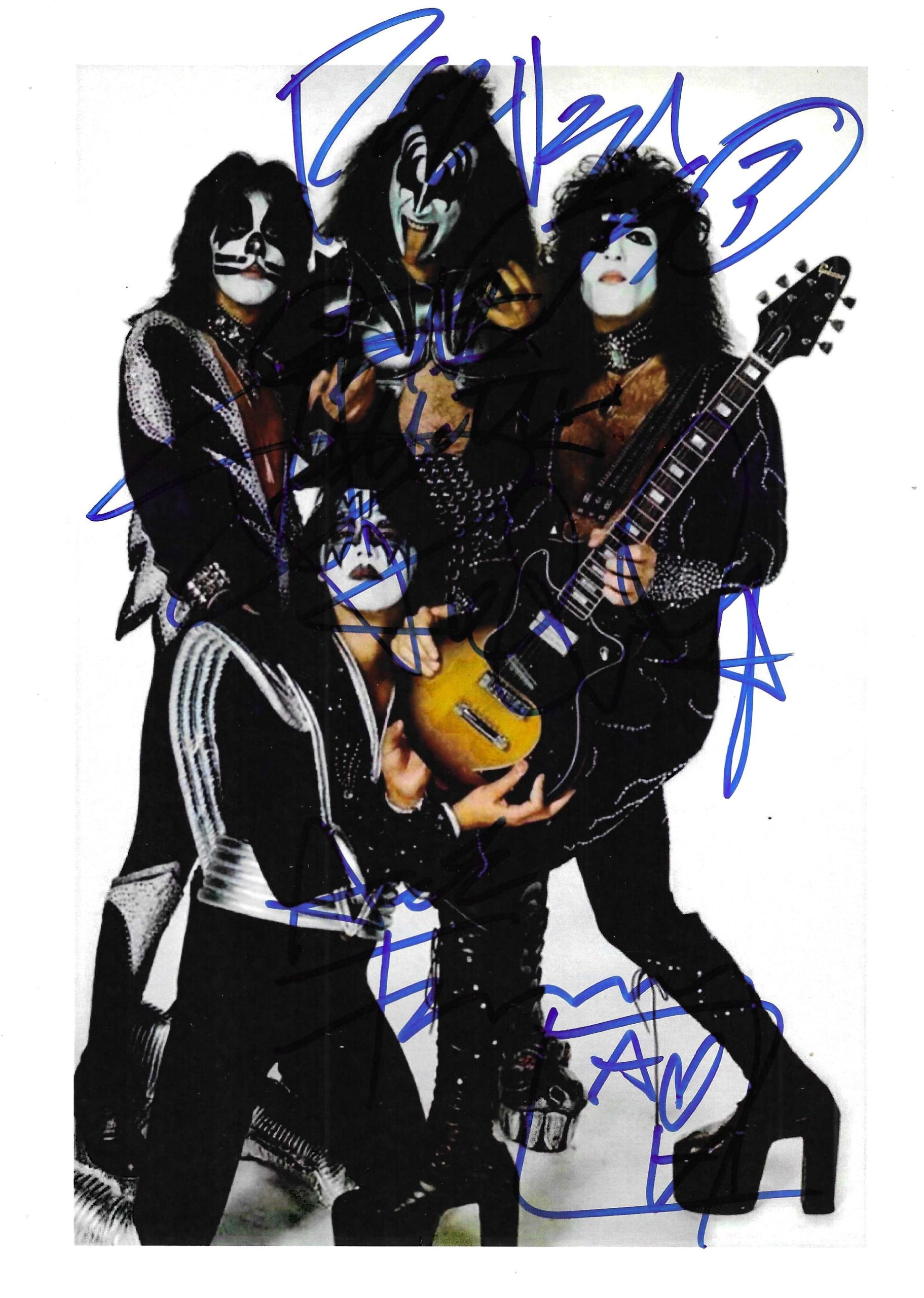 Full color photograph is Rock and Roll Hall of Famers KISS dressed in full regalia. Hand signed by Gene Simmons, Paul Stanley, Peter Criss and Ace Frehley.